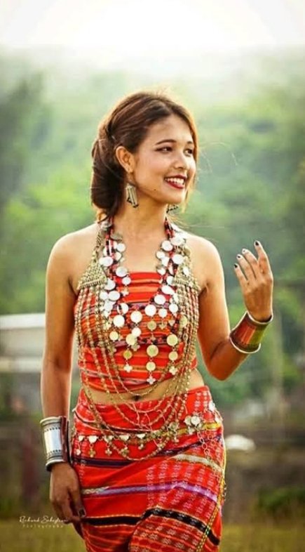 So,the traditional attire of Tripura for women is Risa , Rignai and Rikutu. Risa is a small piece of embroidered cloth used to cover the chest part of the body. The Rikutu covers the upper half part of the body whereas Rignai covers the lower part of the body. This three elements make up the elegant and gorgeous attire. The traditional tripuri attire is made up of white and red coloured embroidered cloth. These clothes are woven using hand spun thread of cotton. Thus the clothes are very durable and easy to wear.